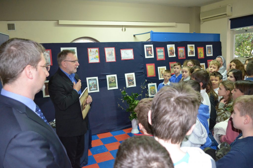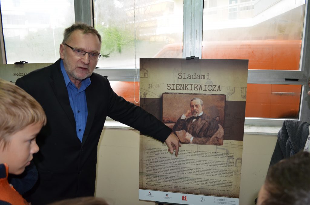 Na uroczystym otwarciu wystawy nie zabrakło także przemówienia autora ekspozycji Pana Bogusława Niemirki pracownika Instytutu Badań Literackich Polskiej Akademii Nauk. Z zawodu prawnik, z zamiłowania historyk i regionalista, przez przypadek znalazł w księgach hipotecznych łukowskich księgę dóbr Okrzeja, będących dobrami rodziny Cieciszowskich, z której pochodziła matka Henryka Sienkiewicza, Stefania. Dzięki tym materiałom i informacjom, jakie w nich znalazł, został… sienkiewiczologiem, czego owocem jest m.in. niniejsza wystawa. Pan Bogusław Niemirka skupił się podczas swego wykładu na powiązaniach pisarza z Atenami i Grecją. Podkreślił, że dwa tygodnie, które spędził Sienkiewicz w Atenach w listopadzie 1886 były dla niego czasem niezwykłym, kiedy mógł się zanurzyć w atmosferę starożytnych Aten, poczuć obecność Platona i Sokratesa: „Pisarz był zafascynowany Atenami, codziennymi wędrówkami po Akropolu i atmosferą tego miejsca. […] Choć nie był prymusem w szkole i nie garnął się do nauki greki, z zamiłowania i zawodu przesiąkł tradycjami greckimi”. Pan Bogusław Niemirka w sposób sugestywny opowiedział o twórczości pierwszego polskiego noblisty, o filmowym charakterze jego dzieł, które stanowią gotowy scenariusz i w większości zostały przeniesione na ekran, jednocześnie dzięki tej wizualizacji przybliżając twórczość Henryka Sienkiewicza uczniom naszej szkoły.