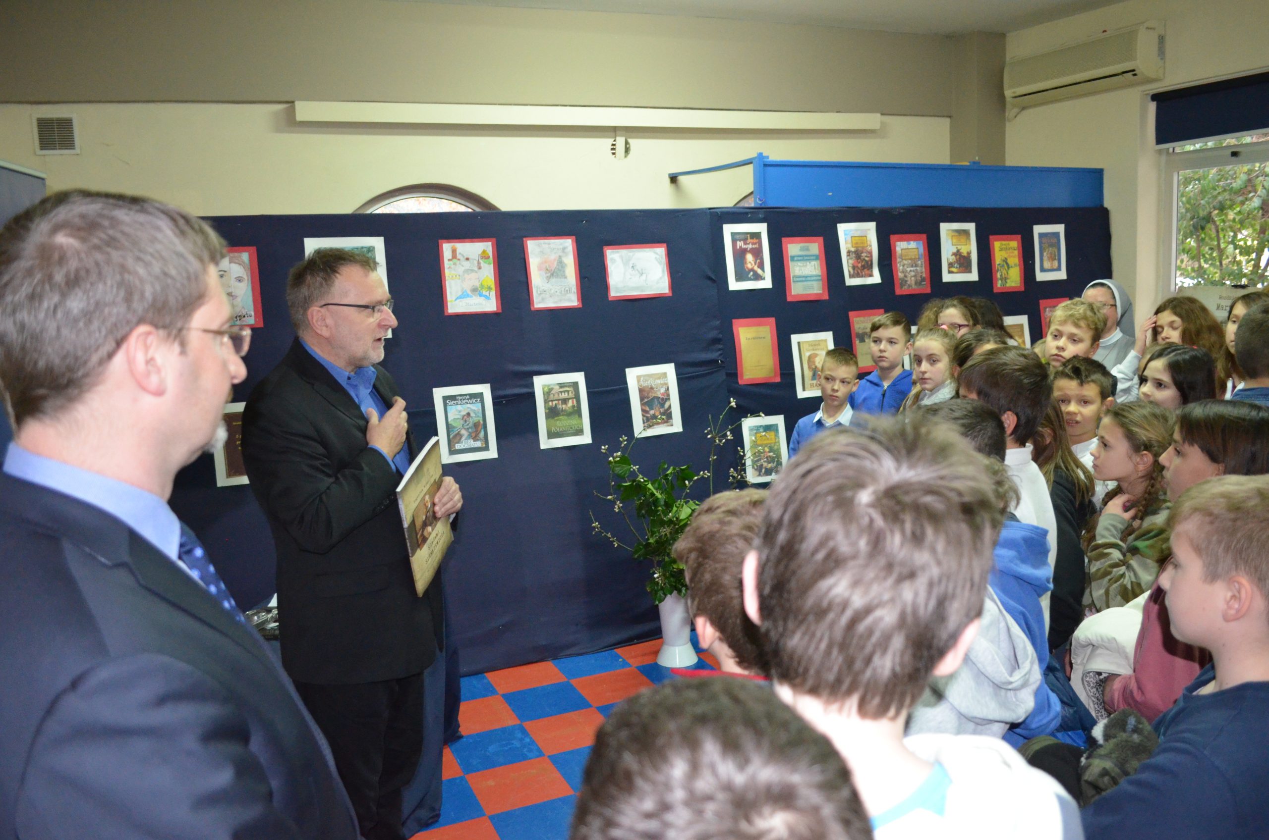 Na uroczystym otwarciu wystawy nie zabrakło także przemówienia autora ekspozycji Pana Bogusława Niemirki pracownika Instytutu Badań Literackich Polskiej Akademii Nauk. Z zawodu prawnik, z zamiłowania historyk i regionalista, przez przypadek znalazł w księgach hipotecznych łukowskich księgę dóbr Okrzeja, będących dobrami rodziny Cieciszowskich, z której pochodziła matka Henryka Sienkiewicza, Stefania. Dzięki tym materiałom i informacjom, jakie w nich znalazł, został… sienkiewiczologiem, czego owocem jest m.in. niniejsza wystawa. Pan Bogusław Niemirka skupił się podczas swego wykładu na powiązaniach pisarza z Atenami i Grecją. Podkreślił, że dwa tygodnie, które spędził Sienkiewicz w Atenach w listopadzie 1886 były dla niego czasem niezwykłym, kiedy mógł się zanurzyć w atmosferę starożytnych Aten, poczuć obecność Platona i Sokratesa: „Pisarz był zafascynowany Atenami, codziennymi wędrówkami po Akropolu i atmosferą tego miejsca. […] Choć nie był prymusem w szkole i nie garnął się do nauki greki, z zamiłowania i zawodu przesiąkł tradycjami greckimi”. Pan Bogusław Niemirka w sposób sugestywny opowiedział o twórczości pierwszego polskiego noblisty, o filmowym charakterze jego dzieł, które stanowią gotowy scenariusz i w większości zostały przeniesione na ekran, jednocześnie dzięki tej wizualizacji przybliżając twórczość Henryka Sienkiewicza uczniom naszej szkoły.