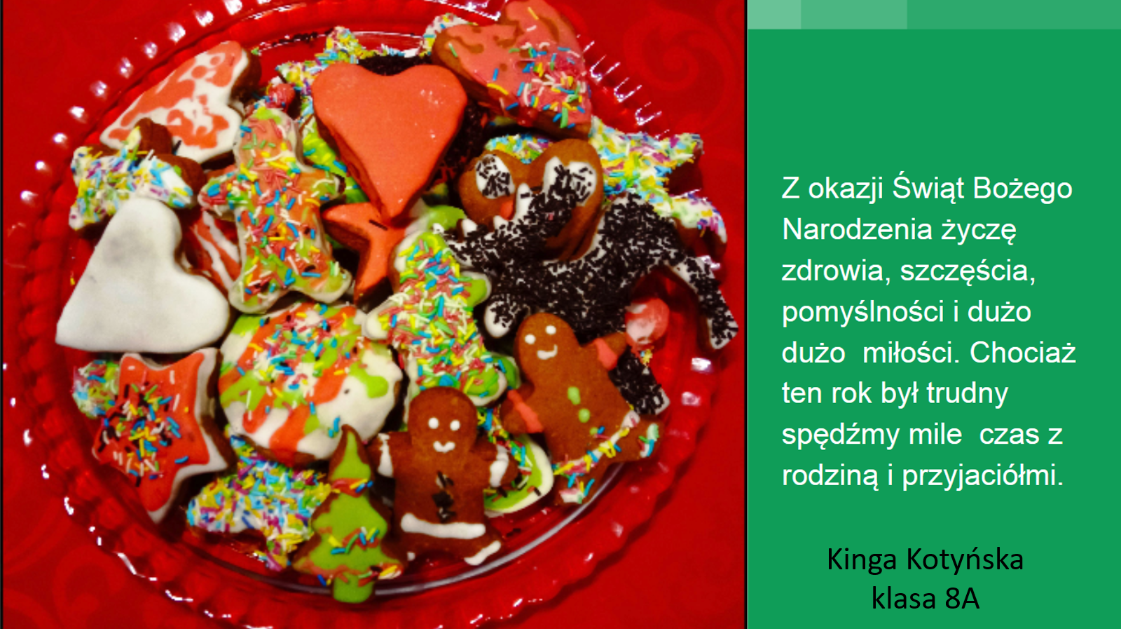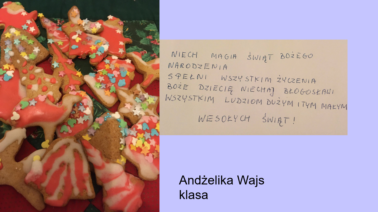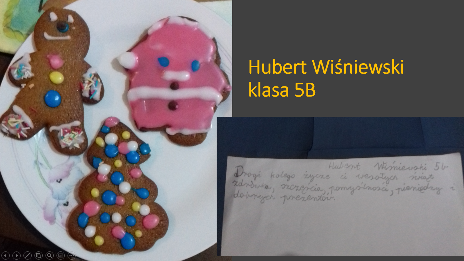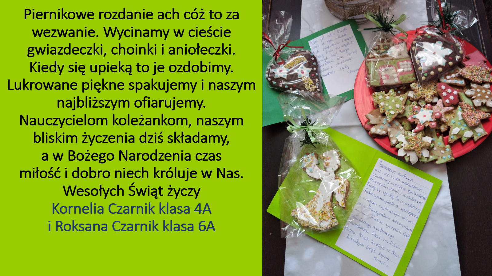 „Jeśli będzie możliwość spotkania się w szkole przed świętami, prosimy o podarowanie kilku ładnie zapakownych pierników kolegom, koleżankom i nauczycielom. Jeżeli nie wrócimy do szkoły, to podarujcie pierniki sąsiadom lub osobom, które dażycie sympatią”.