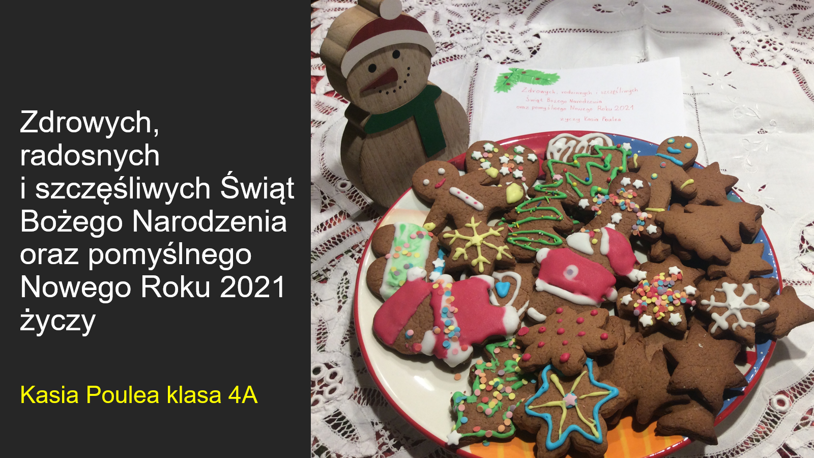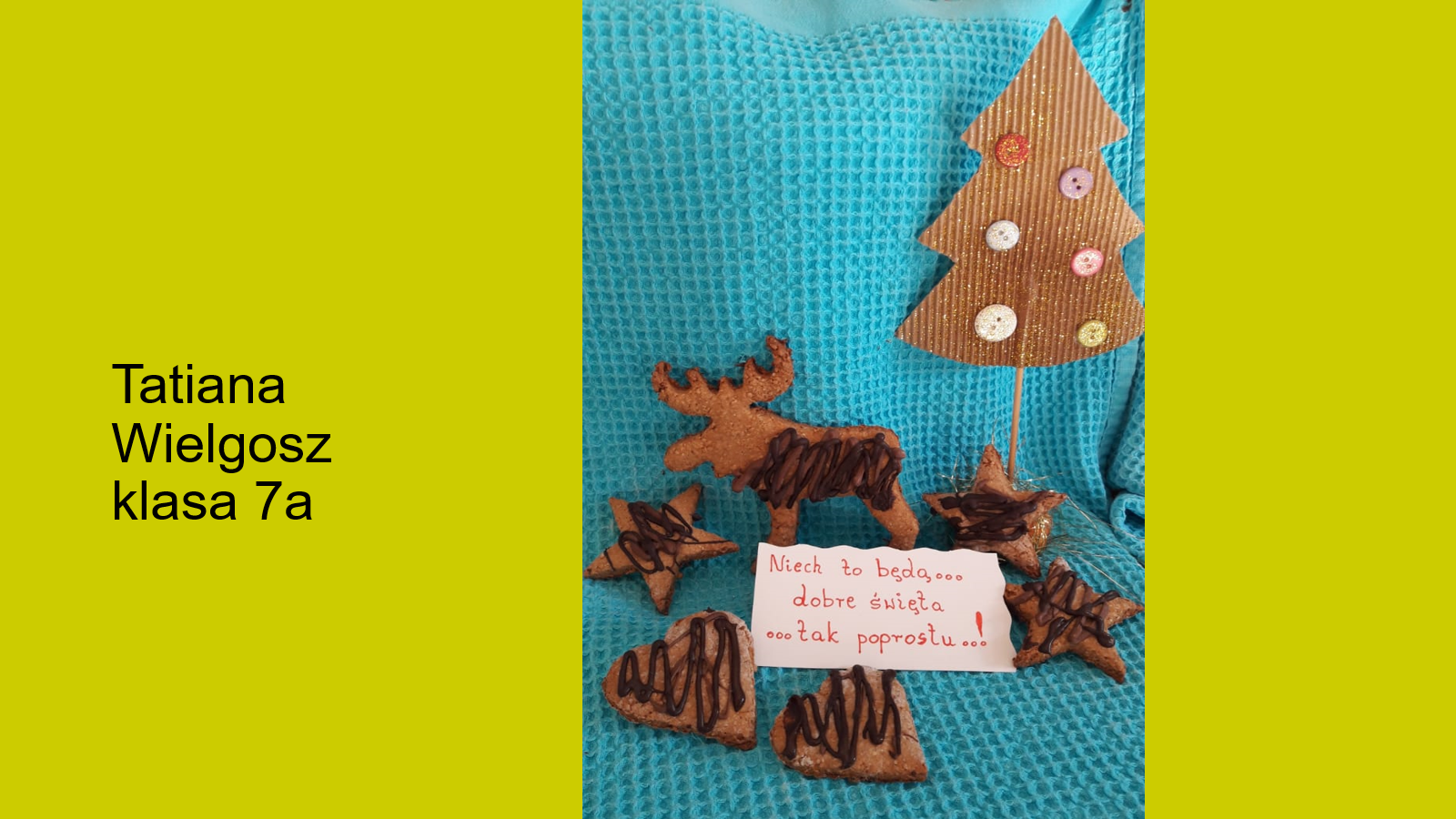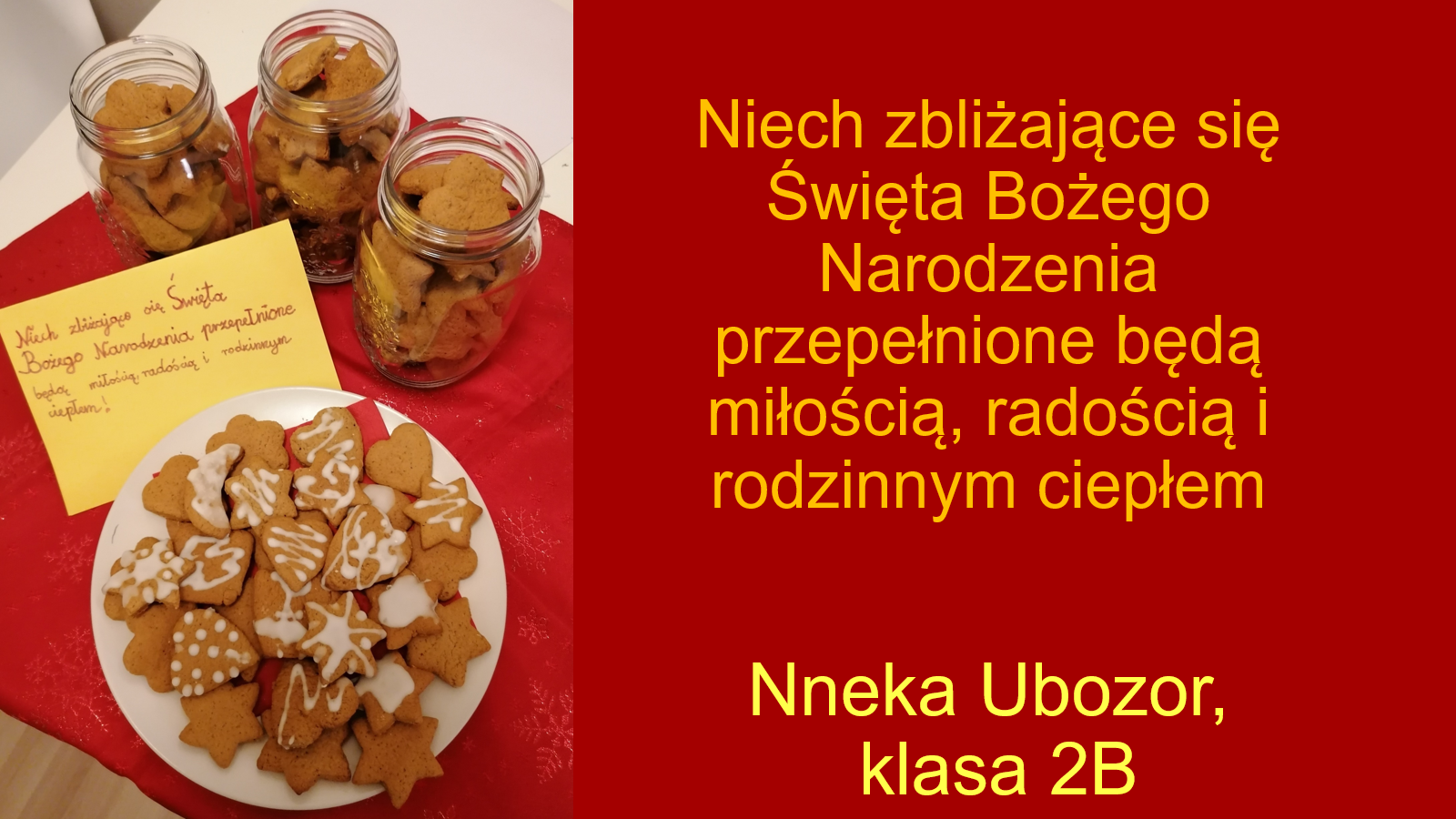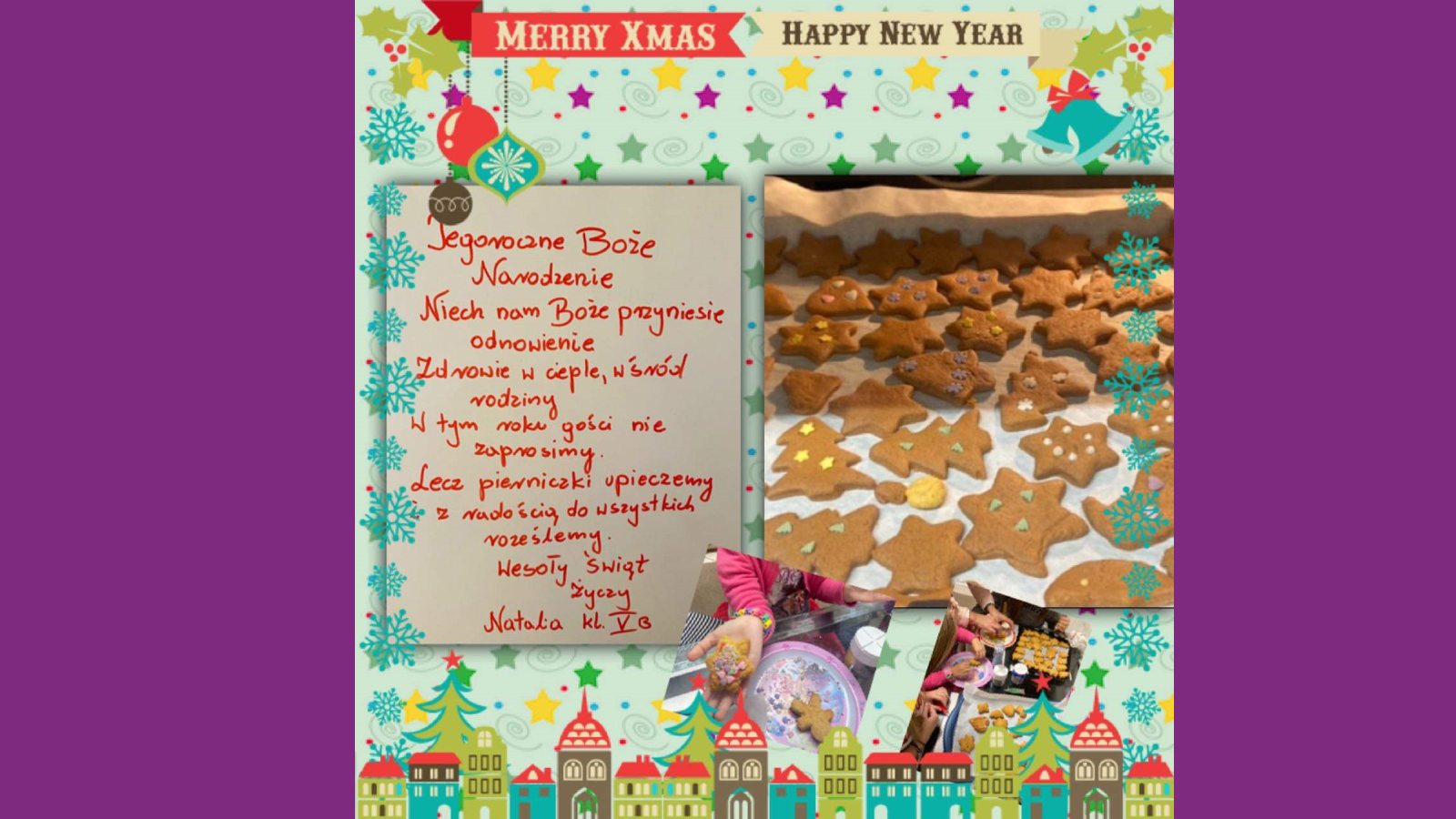„Jeśli będzie możliwość spotkania się w szkole przed świętami, prosimy o podarowanie kilku ładnie zapakownych pierników kolegom, koleżankom i nauczycielom. Jeżeli nie wrócimy do szkoły, to podarujcie pierniki sąsiadom lub osobom, które dażycie sympatią”.