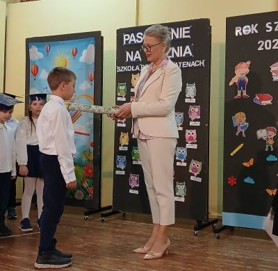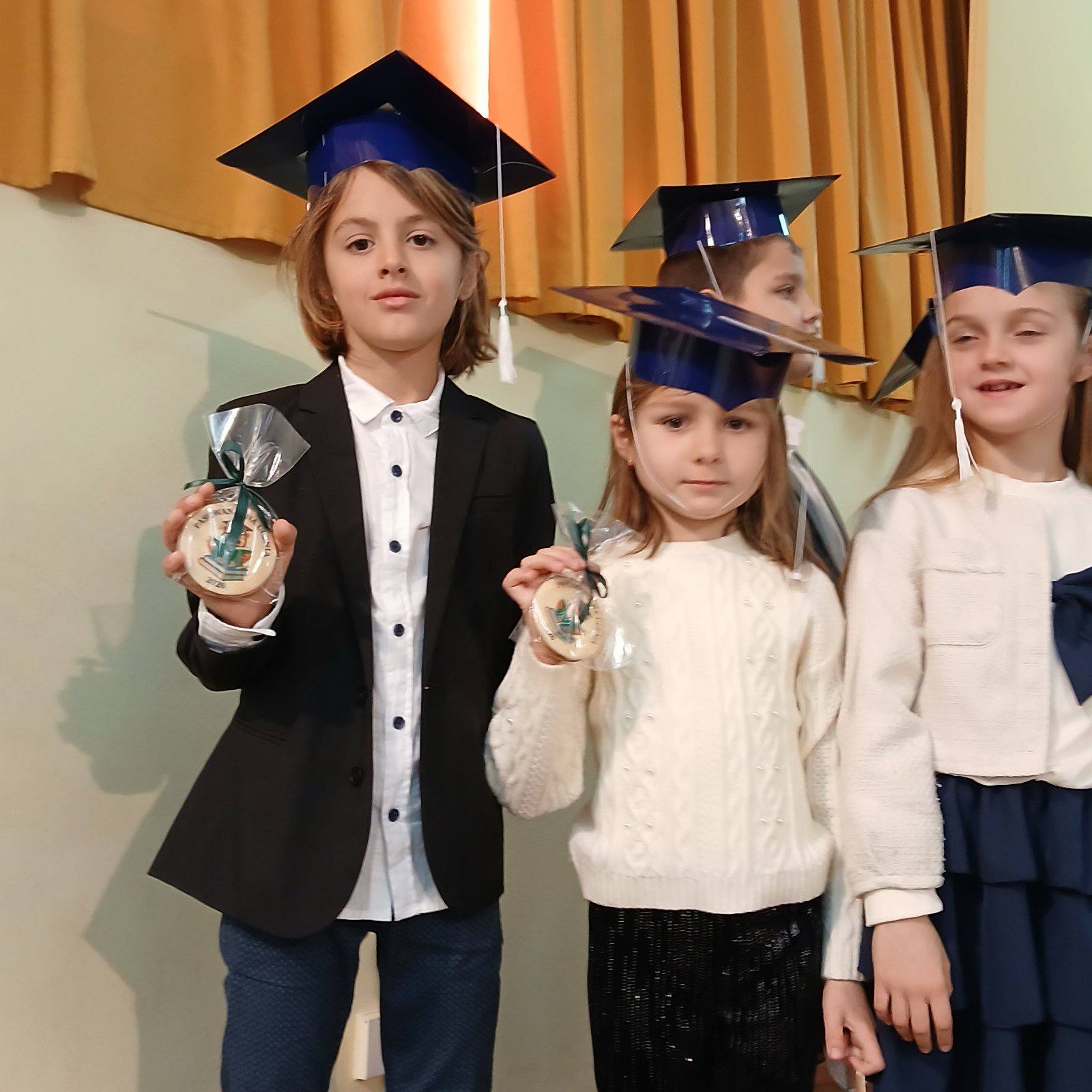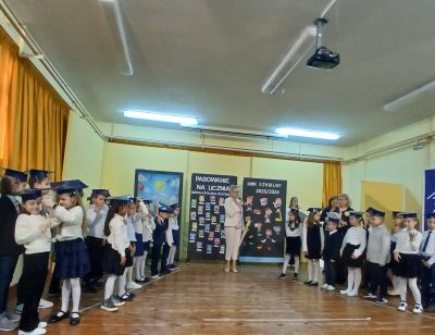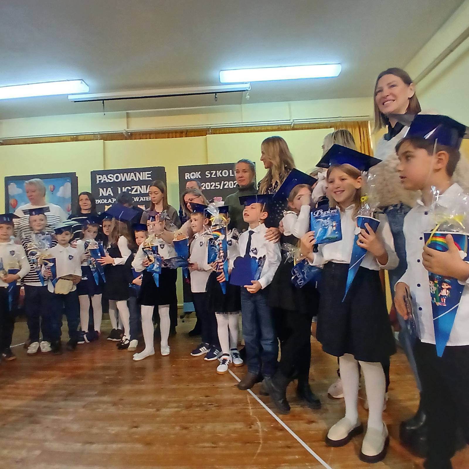 Pierwszoklasiści spisali się znakomicie, a ich występy zostały nagrodzone gromkimi brawami. Dzieci otrzymały od rodziców pamiątkowe dyplomy, rożki obfitości ze słodyczami oraz birety, natomiast Rada Rodziców ufundowała tarcze szkolne oraz dwa przepyszne ciasta na poczęstunek.