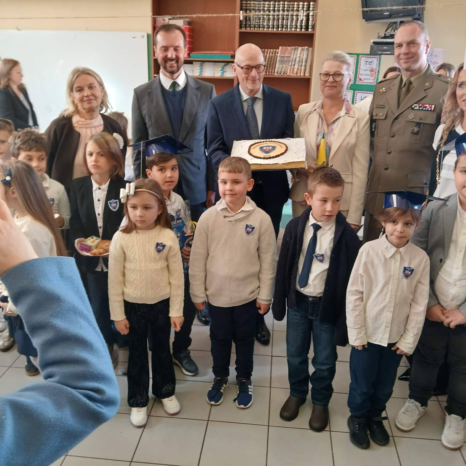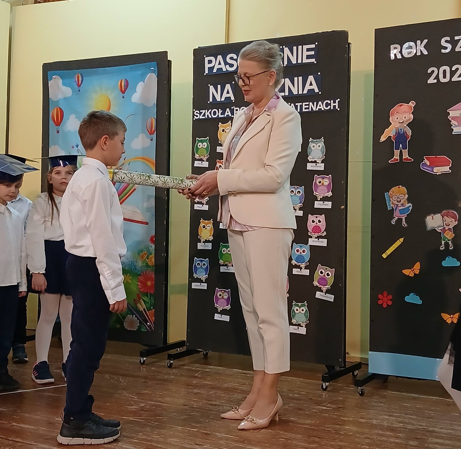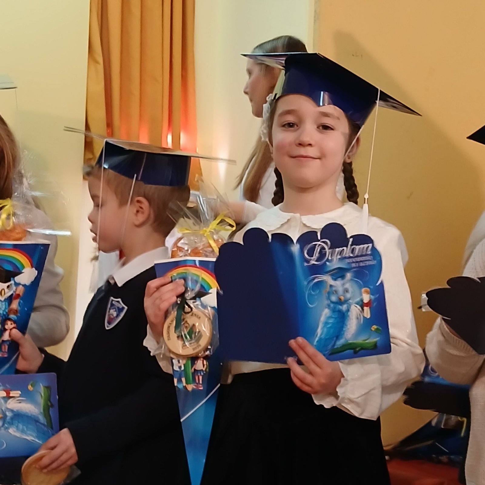 Pierwszoklasiści spisali się znakomicie, a ich występy zostały nagrodzone gromkimi brawami. Dzieci otrzymały od rodziców pamiątkowe dyplomy, rożki obfitości ze słodyczami oraz birety, natomiast Rada Rodziców ufundowała tarcze szkolne oraz dwa przepyszne ciasta na poczęstunek.