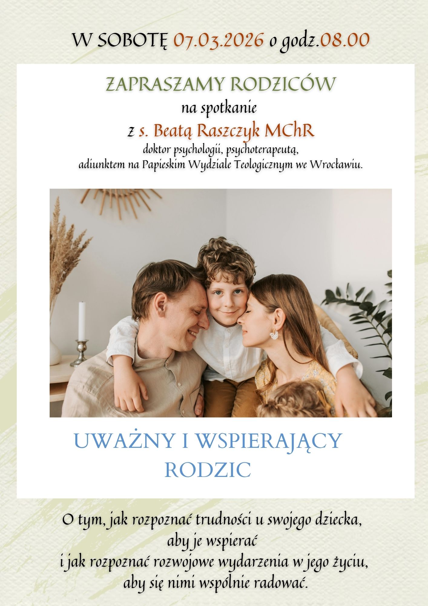 Serdecznie zapraszamy Rodziców naszej Szkoły na wyjątkowe spotkanie z s. Beatą Raszczyk MChR – doktor psychologii, psychoterapeutą oraz adiunktem na Papieski Wydział Teologiczny we Wrocławiu.